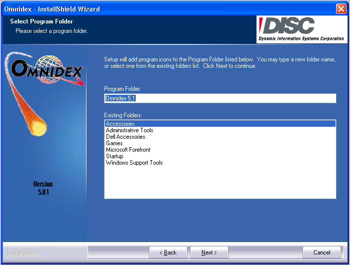 The next screen allows you to choose the folder within the Start Menu for installing Omnidex. By default, Omnidex is installed in the Omnidex 5.1 folder; however, it can be installed in another folder if desired.