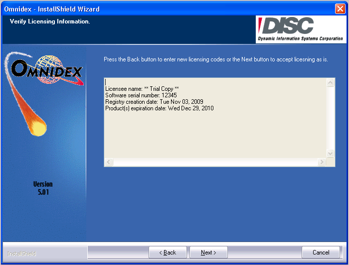 The Omnidex Licensing Wizard will display default license codes. If you are installing a trial copy of Omnidex, simply make sure that the expiration date is in the future and then choose Next. If you wish to enter other license codes, choose Back to enter new codes.