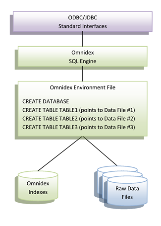 Omnidex provides access to raw data files by creating a database around them. The Omnidex administrator creates an Omnidex Environment File that declares a complete database with table and column definitions, table constraints and Omnidex indexes. The tables simply point to the raw data files as their source of data. Omnidex applications can then query the database without any concern whether the underlying data came from a relational database or raw data files.